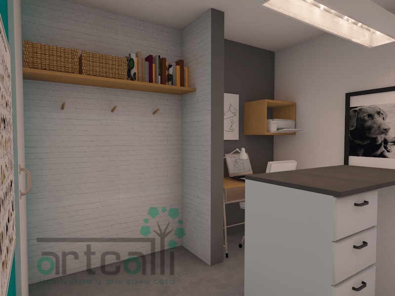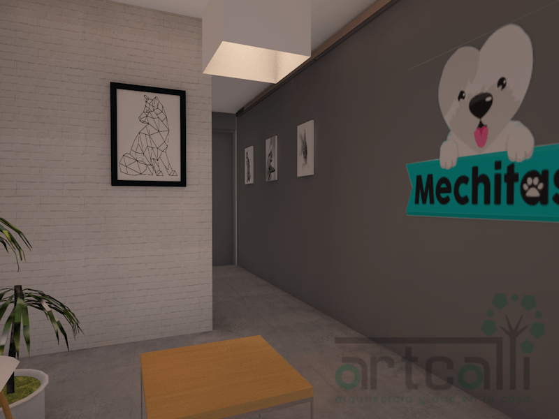 Proyecto realizado para local veterinario ubicado en el Estado de México, cuya propuesta comprendió el reacondicionamiento de los espacios existentes, originalmente de uso habitacional, a uso médico. Para ello se consideraron los siguientes locales: recepción y área de venta de accesorios, área de estética, área de consultorios (consultorio principal, consultorio-área de cirugías) y sanitario. La paleta de colores por su parte tuvo como color principal el verde turquesa, color de la marca y que a petición de la clienta se utilizó en los espacios principales del proyecto, el cual cual se buscó complementar con las tonalidades que ofrece la madera con el fin de brindar de cierta calidez al conjunto pero dando predominio al color blanco al interior de los consultorios para un mejor aprovechamiento de la luz natural. Así mismo, se buscó cierta contemporaneidad al proponer colores más sobrios como el color gris en los espacios de transición como fue el caso del acceso a los consultorios.